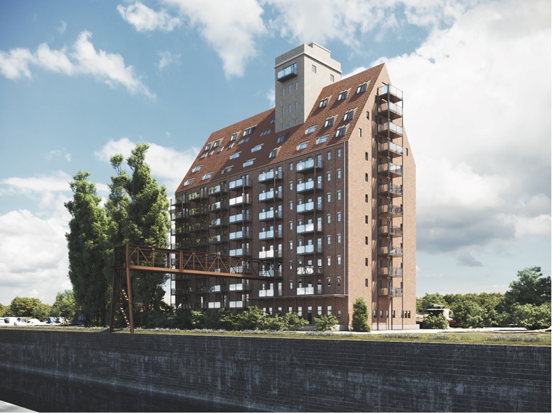 Die etwa 80 Jahre alten Silogebäude erzählen von vergangenen Tagen und werden auch nach dem Umbau und der Sanierung nicht verstummen. Im Einklang mit der historischen Substanz werden auf 15 Geschossen 116 Wohnungen und 15 Gewerbeeinheiten, je Gebäude, mit der Effizienzklasse EH 40 EE entstehen. Die Wohnungen und Gewerbeeinheiten verfügen zudem über insgesamt 283 Stellplätze.